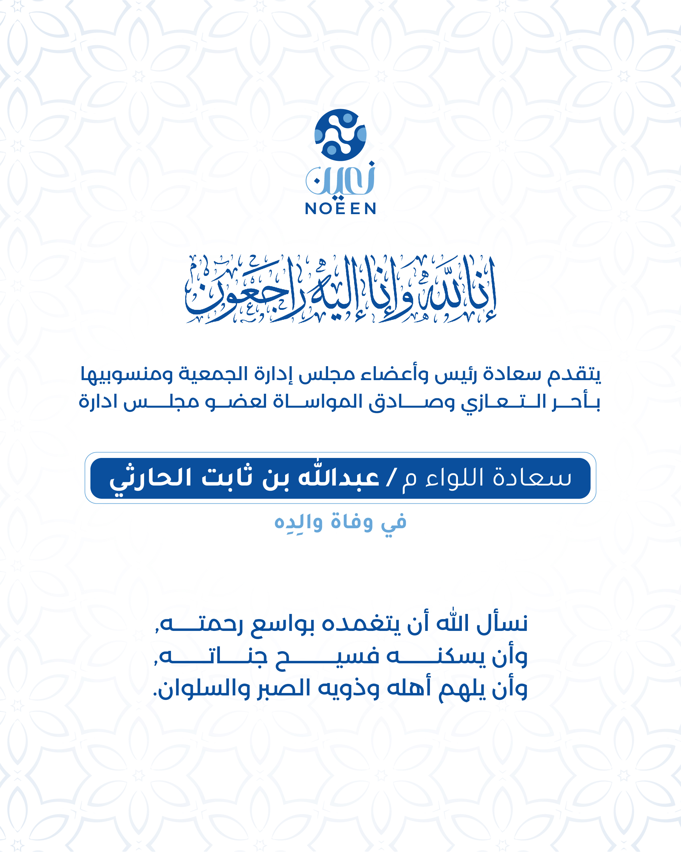 تتقدم جمعية نعين للخدمات الإلكترونية ، ممثلةً بسعادة رئيس مجلس الإدارة وأعضاء مجلس الإدارة ومنسوبيها، بأحر التعازي وصادق المواساة إلى